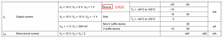 我上面举例的电路,运放是往外输出电流的,这个电流叫做拉电流(Source)。如果电流是从输出端往运放里面流,那么就是灌电流(sink)。图中的吸电流应该就是拉电流的意思,我找了对应的英文的手册,里面就是source。